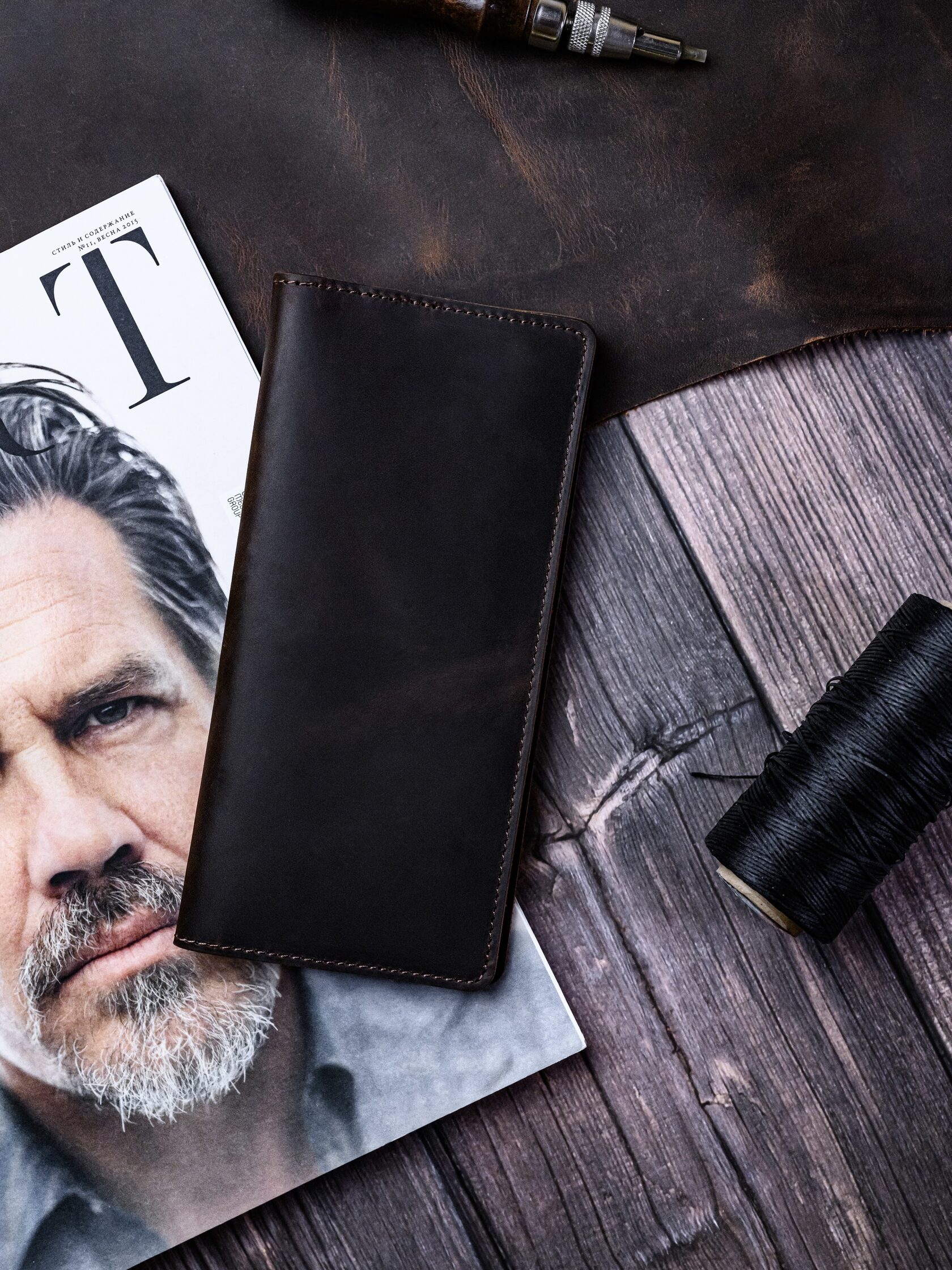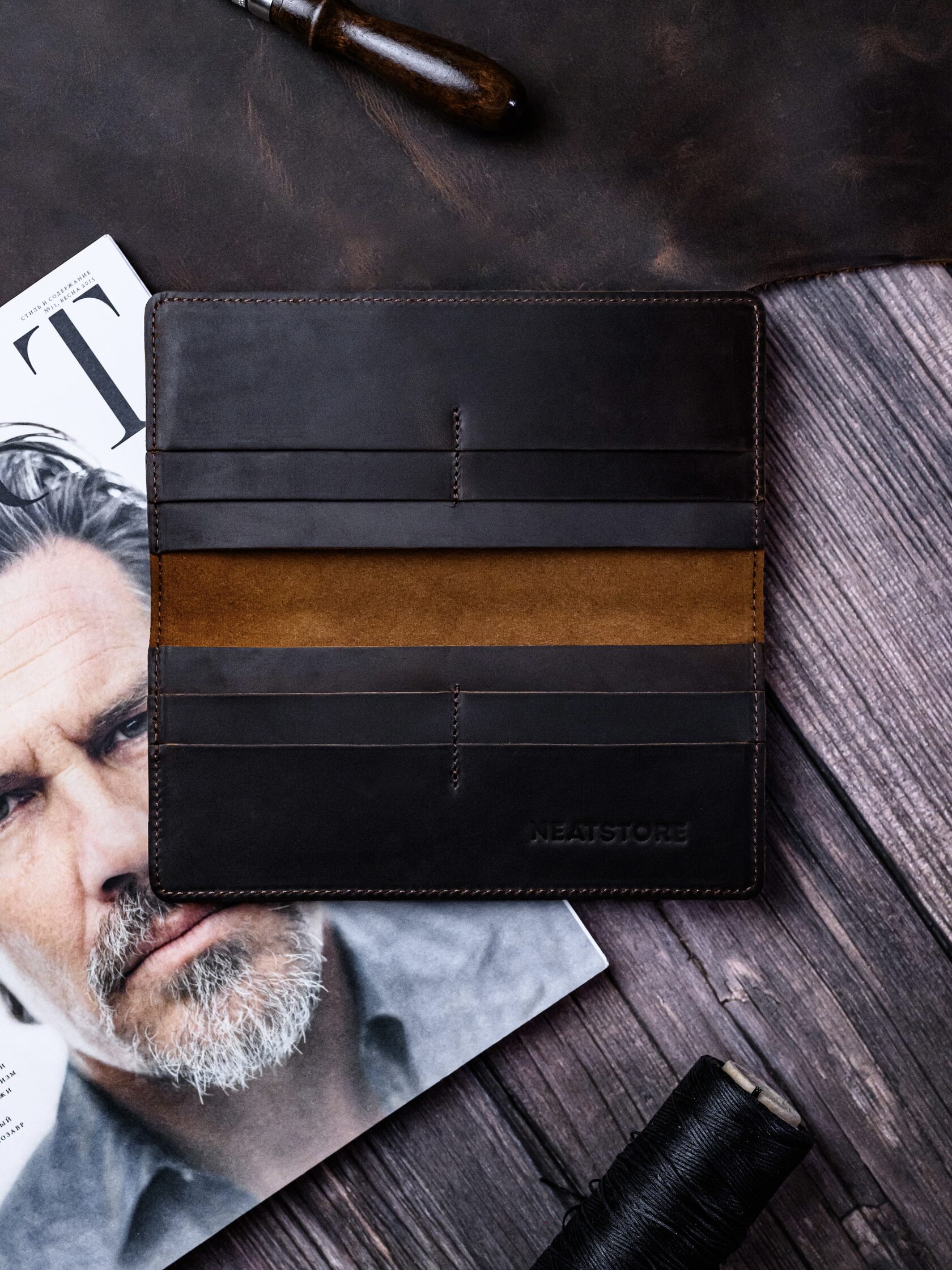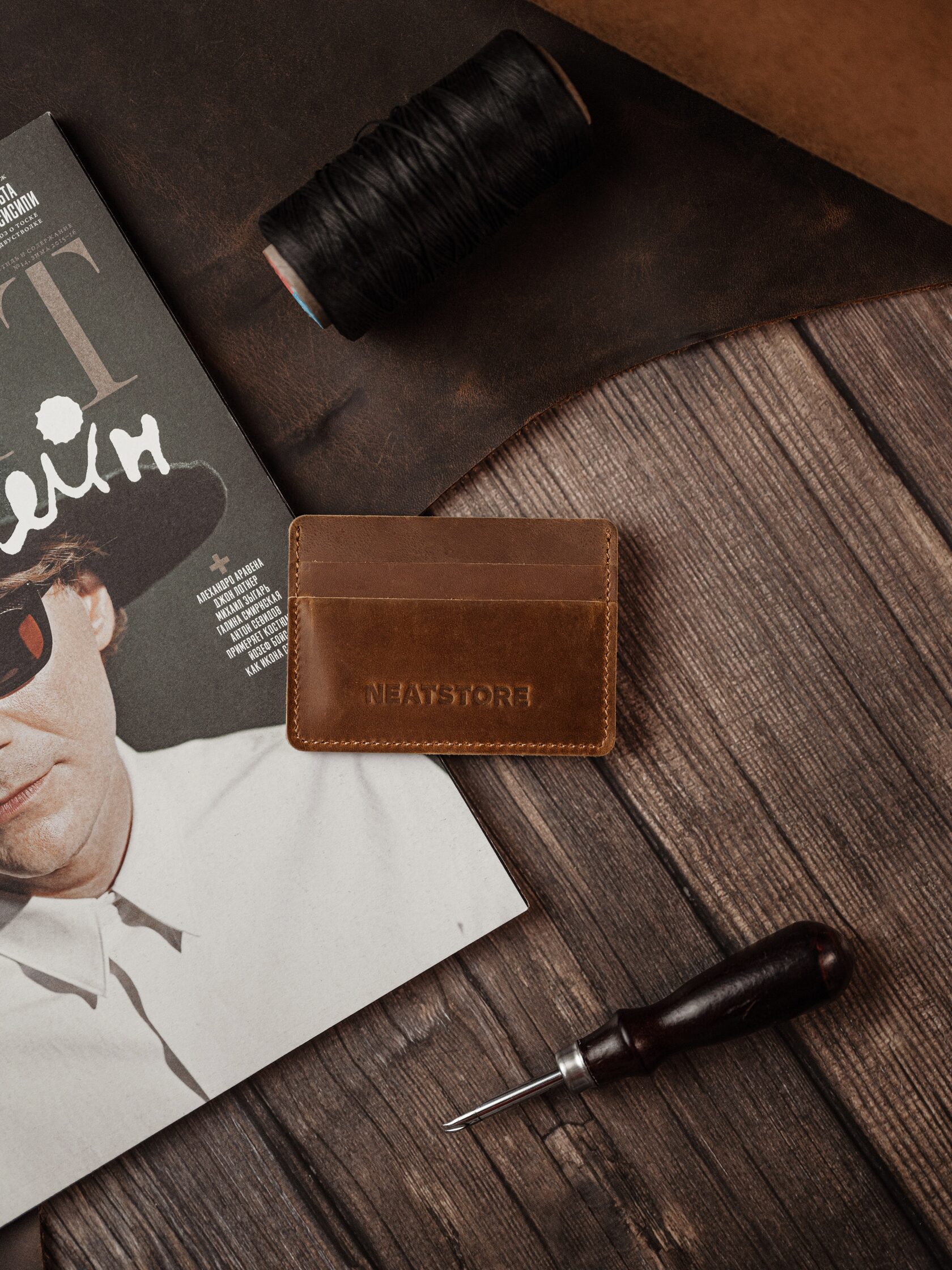 Мы шьем изделия из высококачественной натуральной кожи дубления CRAZY HORSE, 1-й сорт. Толщина кожи около 1.4-1.6 мм, поверхность полуматовая, без лака и финиша, тактильно очень приятная на ощупь. Отлично держит форму без подкладки и дублирующих материалов. Красиво патинируется при частом использовании изделия.