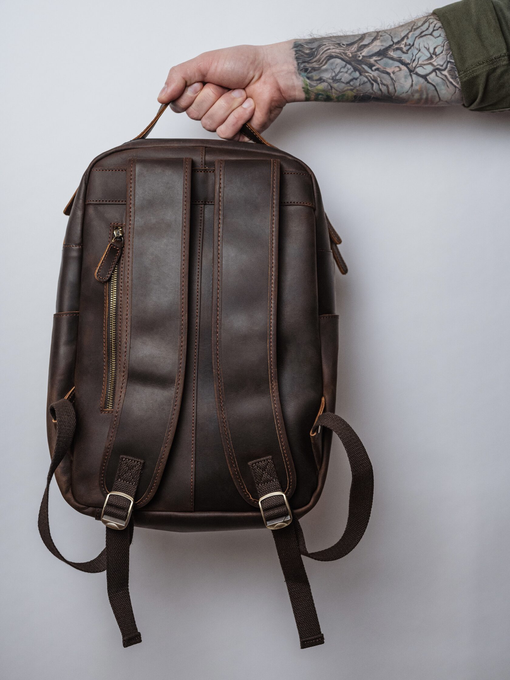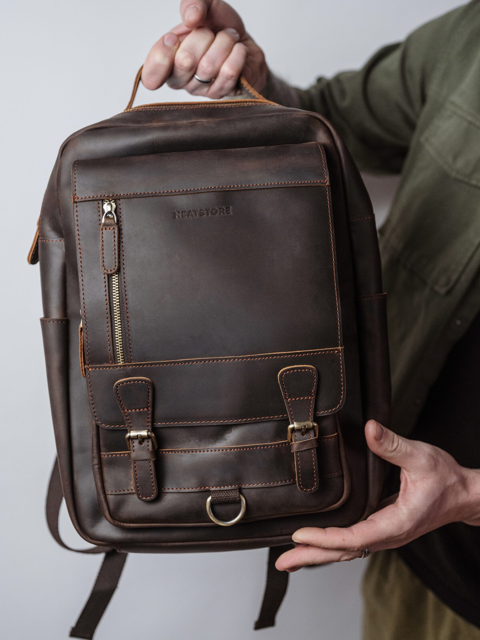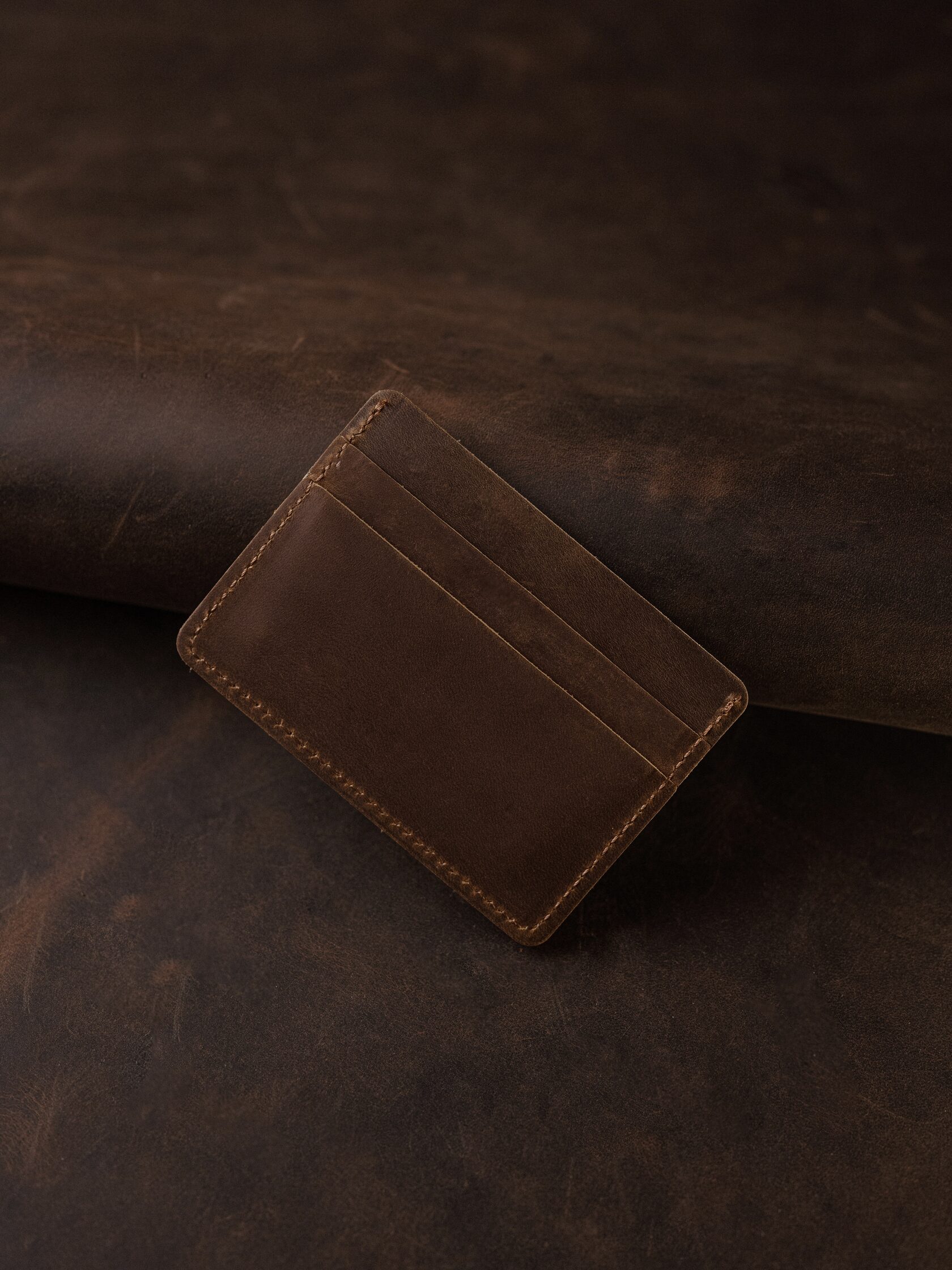 Мы шьем изделия из высококачественной натуральной кожи дубления CRAZY HORSE, 1-й сорт. Толщина кожи около 1.4-1.6 мм, поверхность полуматовая, без лака и финиша, тактильно очень приятная на ощупь. Отлично держит форму без подкладки и дублирующих материалов. Красиво патинируется при частом использовании изделия.